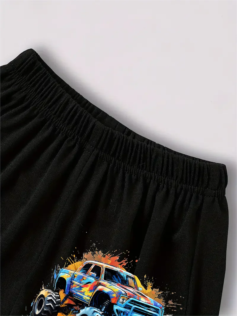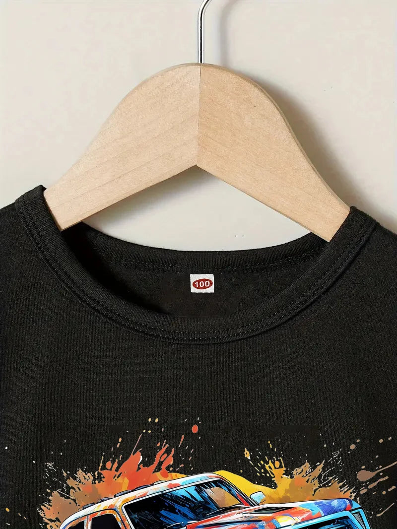 2 Piece Car Print Short Sleeve Suit, Suitable For Boys Summer Wear