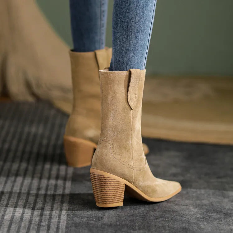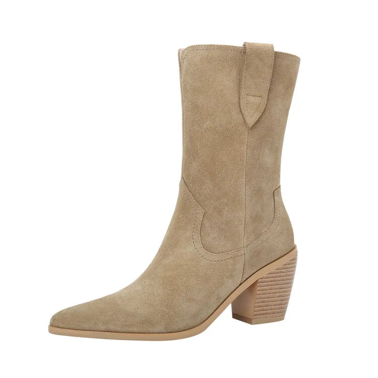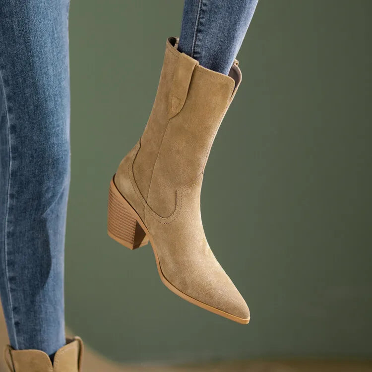 2022 New Autumn/winter Women's Boots Pointed Toe Chunky Heel Short Boots Cow Suede Western Boots Shoes for Women High Heels
