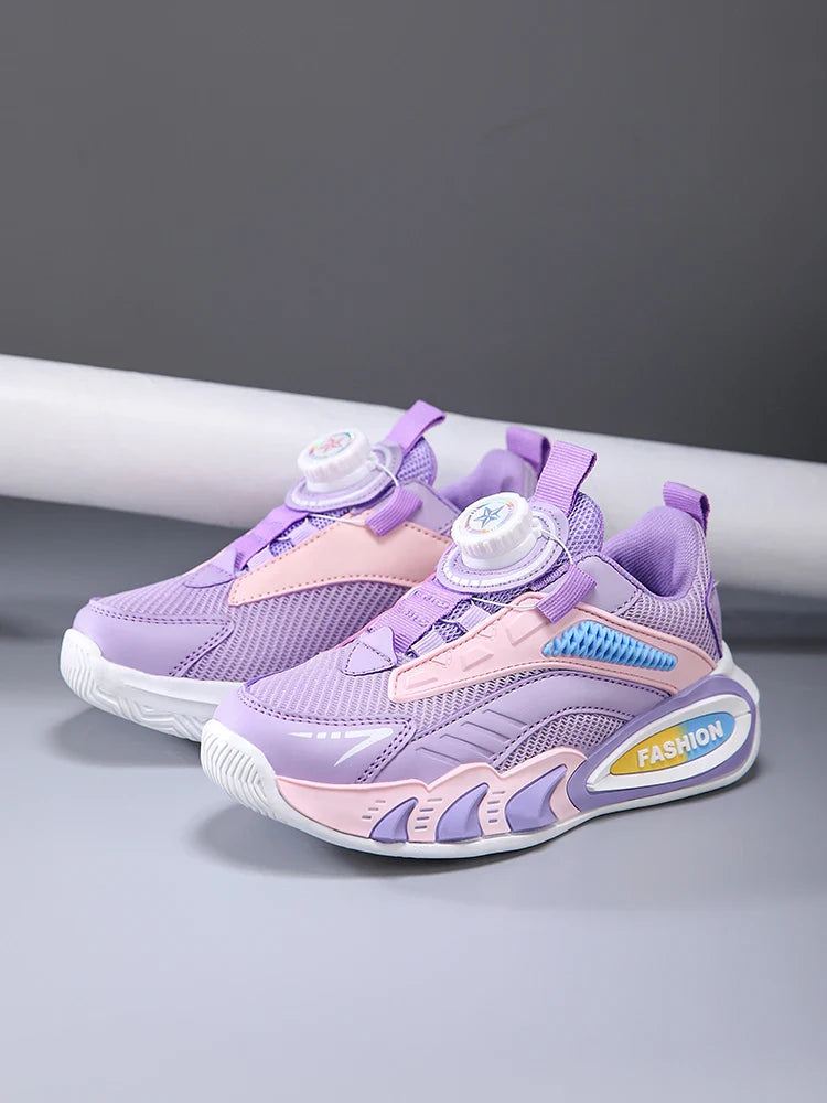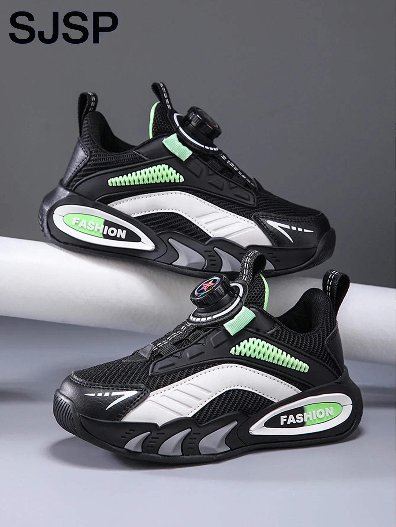 Boys' New Trendy Color-Blocked Mesh Sneakers with Knob Buckle, Dad Shoe Style Breathable Children's Shoes, Spring and Autumn Campus Outdoor Non-Slip Running Shoes, Casual Sports Trendy Shoes