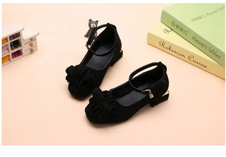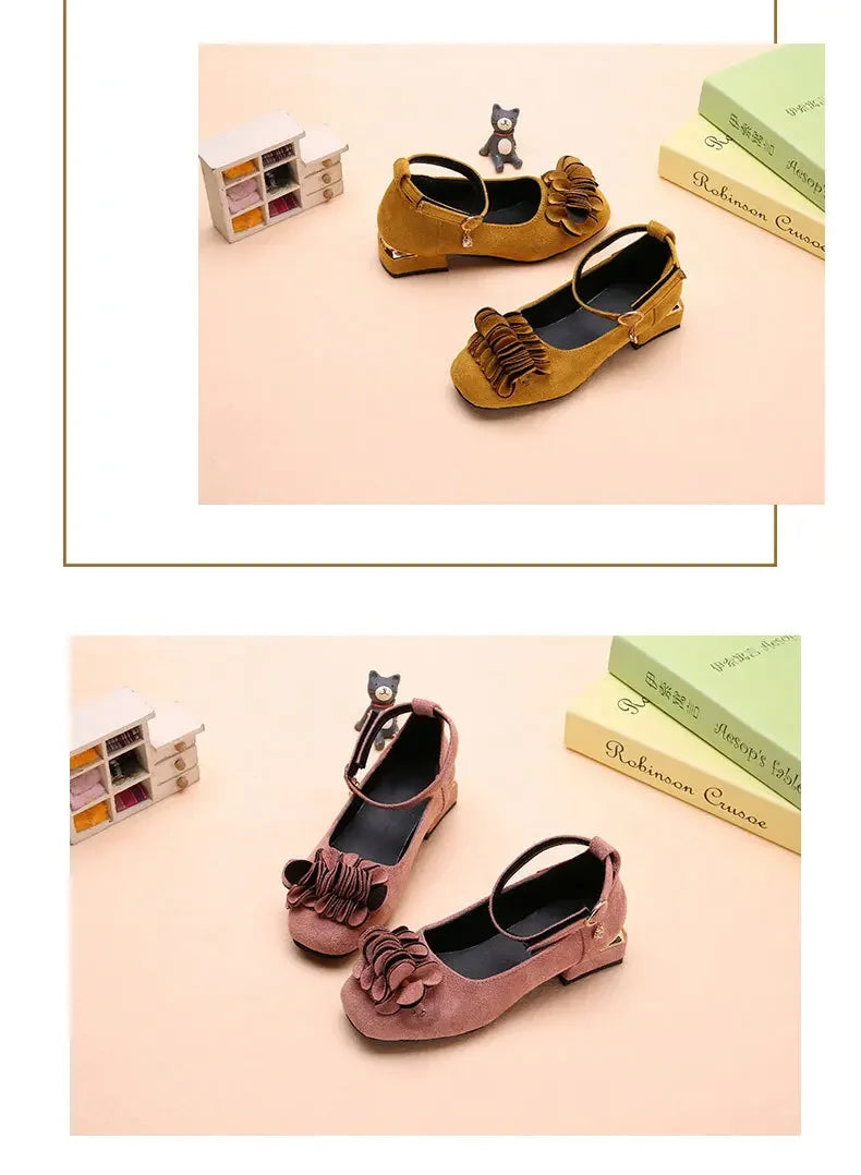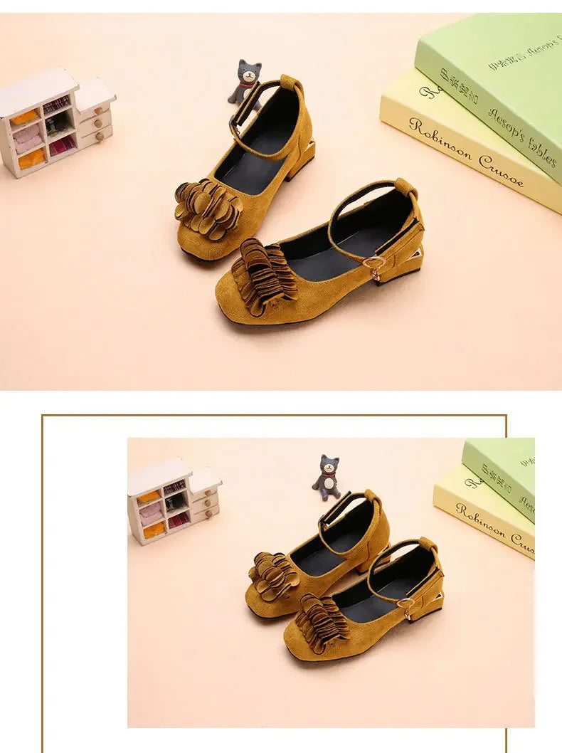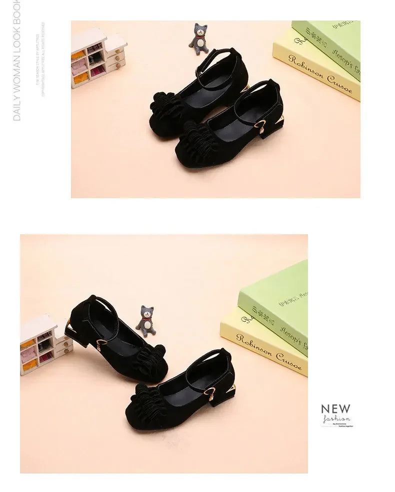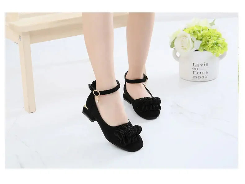 Girls Party Shoes High Heeled Fashion Princess with Flowers Sweet Chic Kids Leather Shoes for Wedding Model Shoes Ankle-strap