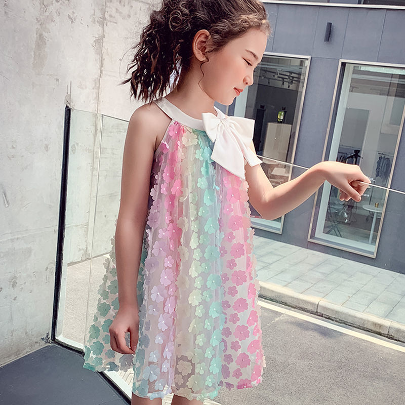 Girls sleeveless dress 2025 summer new color 3D flower skirt children's bow princess skirt