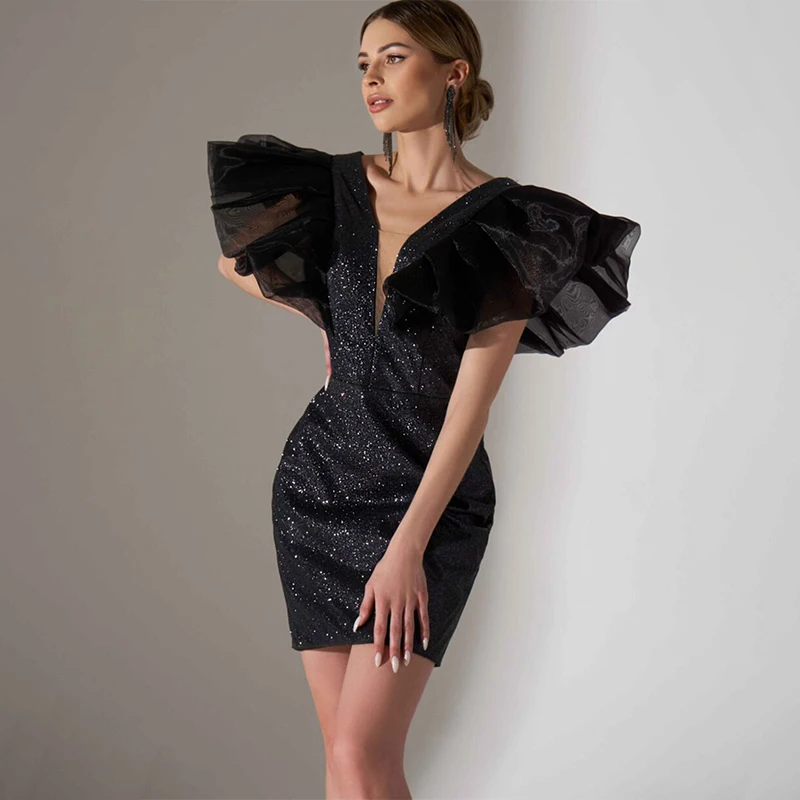 Women's Party Evening Dress Floating Sleeves Fashion Tulle Sequined Backless Bodycon Dress Elegant Slim Fit Black Maxi Dress