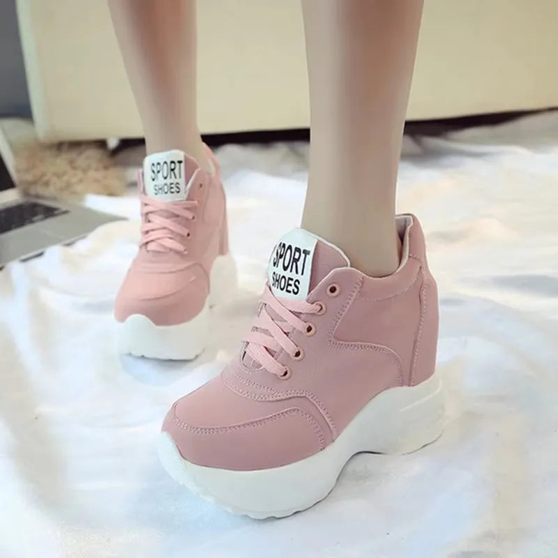 Women's Vulcanize Shoes PU Leather White/Black/Pink Sneakers For Woman Fashion High Heels Chunky Sneakers Female Platform Shoes